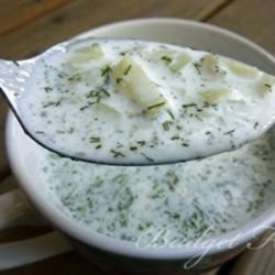 1Combine the grated cucumber, lemon juice, mint, dill, garlic, yogurt, olive oil, and salt in a large mixing bowl; stir with a large spoon. Pour the mixture into a blender; blend on high speed until smooth. Serve immediately or chill in refrigerator until ready to serve. Divide the soup between four bowls; top each serving with about 1 tablespoon raisins.