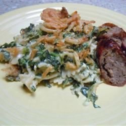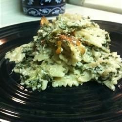 3Mix cooked and drained spaghetti, 2 cups grated Monterey Jack cheese, thawed spinach, and half of the French fried onions to the slow cooker. Stir contents of slow cooker until just blended.