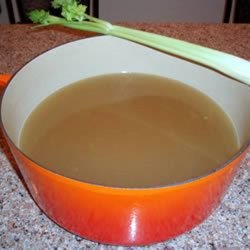 3Add salt and water and bring to a boil. Lower heat and simmer, uncovered, for 30 minutes. Strain. Discard vegetables.
