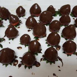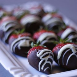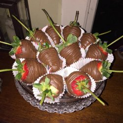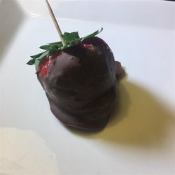 "This is the simplest version of chocolate covered strawberries I know. Paraffin was originally used instead of shortening. Turn the strawberries upside down and insert by the toothpicks into a piece of styrofoam for easy cooling, or simply place them on a sheet of wax paper. White chocolate may be drizzled over the milk chocolate for a fancier look. They are perfect for weddings when decorated with frosting bow ties, bells, butterflies, roses, etc."