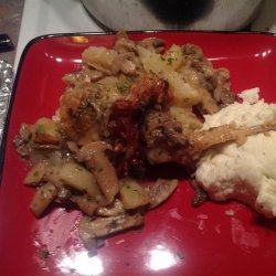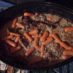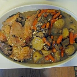 4Place the browned rabbit pieces in a large roasting pan or Dutch oven with a lid, and cover the rabbit with the carrots and potatoes. Pour the mushroom sauce over the rabbit, carrots, and potatoes, cover, and bake in the preheated oven for 1 1/2 hours, until the rabbit and vegetables are tender and the sauce is bubbling.