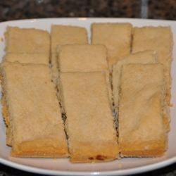 3Press dough into a 10x15 inch jellyroll pan, score into bars and prick with a fork. Sprinkle remaining sugar over the top, and bake for 30 to 35 minutes in the preheated oven, until golden brown. Cut along scored lines into bars while still warm. Cool before serving.