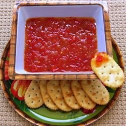 "Spread cream cheese on your favorite crackers and top with this zesty relish. Red bell peppers and sweet onion are simmered in white wine vinegar and red pepper flakes."