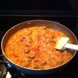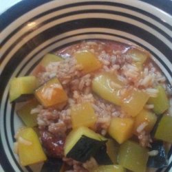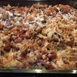 3Cook sausage and onion in a large skillet over medium heat, stirring until evenly browned. Drain excess grease. Stir in zucchini and tomatoes, and cook until tender. Stir in rice, mushrooms, and cheese. Season with oregano, salt, and pepper. Spread into a 9x13 inch baking dish, or a 2 quart casserole dish.