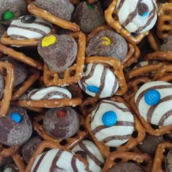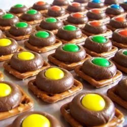 3Place in preheated oven 1 to 2 minutes, until kisses melt. Remove from oven and place one candy-coated chocolate in the center of each pretzel. Chill in refrigerator until set.