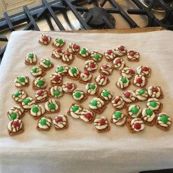 2Place pretzels on baking sheets. Unwrap candy kisses and place one in the center of each pretzel.