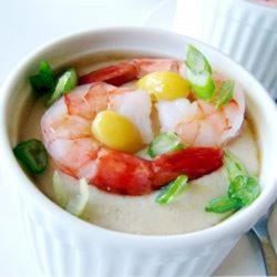 1In a medium bowl, whisk eggs gently while slowly pouring in the chicken stock, sake, and soy sauce. Divide the mushroom and chicken evenly between two small tea cups. Pour the egg mixture into each cup until filled.