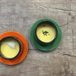 2Bring about 1 inch of water to a boil in a steamer or saucepan. Reduce heat to a simmer, and place cups into the steamer. Cover, and steam for 12 minutes, or until egg is firm but soft and silky like tofu. Garnish each cup with a sprig of parsley, and serve.