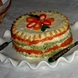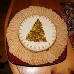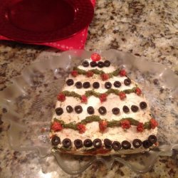 "This is an incredible cheese spread. With the red of the sun-dried tomatoes and the green of the pesto, it makes for a beautiful Christmas appetizer. Garnish with toasted pine nuts and sprigs of basil and serve with crackers."