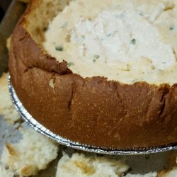 4Remove baked crab dip from the oven, and stir well. Spoon the mixture into the hollowed out loaf. Place bread bowl and chunks of bread on a medium baking sheet, and bake for an additional 10 minutes. Serve hot.