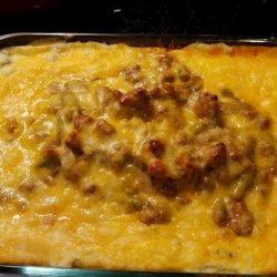 3In a large skillet over medium-high heat, cook ground beef and onion until beef is brown. Drain. Stir in tomato soup and green beans. Pour into a 9x13 baking dish. Mound mashed potatoes in a ring around the meat mixture (do not cover meat). Sprinkle potatoes with shredded cheese.