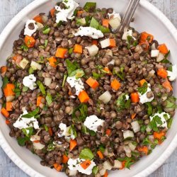 "Great side dish. French lentils (also called puy lentils) have a wonderful earthy flavor. You can't substitute regular green/brown lentils. They are expensive but usually affordable at your local food co-op. Goat cheese has a creamier texture than feta. I like to add grape tomatoes."