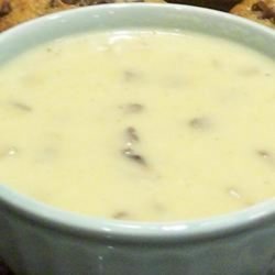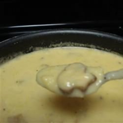 3Mash softened potatoes by hand so they remain lumpy. Stir in Cheddar and Parmesan cheeses until melted, then add milk but do not boil. Cook mushrooms over medium high heat in remaining 1 tablespoon of butter until soft. Add to the soup, and stir. Serve immediately with croutons, if desired.