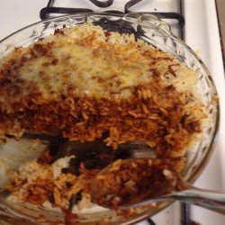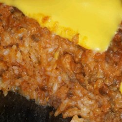 4Spread 1/3 of the rice into the bottom of the prepared baking dish and cover with 1/3 of the ground beef mixture. Place 2 slices of processed cheese over the meat, then cover with 2 more layers of rice and meat. Arrange the remaining 6 slices of cheese over the top.