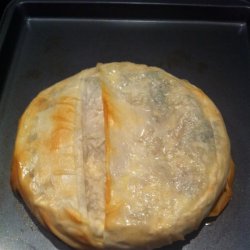 "My ex-wife Jamie's been making this savory Brie en croute since way back before we were married. I think she must have gotten the idea from a magazine, but I've never seen the recipe... I just wing it. It can be made with either puff pastry sheets (quick and easy) or phyllo sheets (more work, flakier shell). Serve with fancy table crackers or digestive biscuits."
