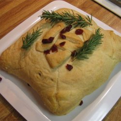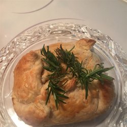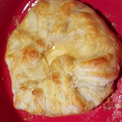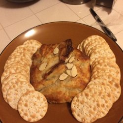 2Slice the wheel of Brie in half, horizontally, so that the halves are two, flatter wheels of Brie. Lay the puff pastry in the pie pan. Place half of the Brie (rind-side down) onto the pastry dough. Sprinkle almonds evenly over the top. Place the other half of the Brie (rind-side up) over the almonds. Bundle the pastry dough around the Brie.