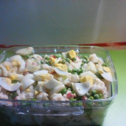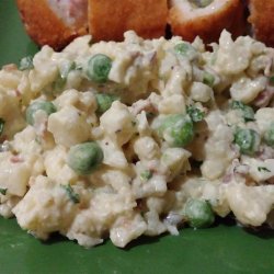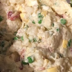 2In a large bowl whisk together the mayonnaise, mustard, salt, and pepper. Add the cauliflower, eggs, onion, peas, dill pickles, and bacon to the dressing and stir until well coated. Cover and refrigerate for 2 to 24 hours. The longer the cauliflower salad chills, the better the flavor.