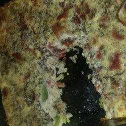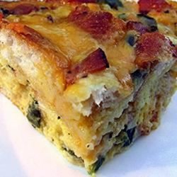 3Beat eggs in a bowl; whisk in yogurt and milk. Pour egg mixture into prepared baking dish. Evenly distribute the tomatoes, bacon, chicken, avocados, and blue cheese on the egg mixture. Sprinkle with chives. Season with salt and pepper.