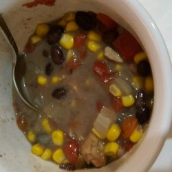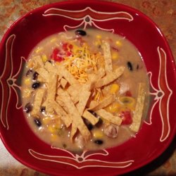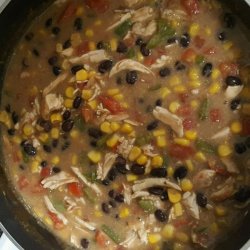 1Stir black beans, chicken broth, corn, chicken chunks, cream of chicken soup, and diced tomatoes with green chile peppers together in a saucepan; bring to a boil, reduce heat to low, and cook at a simmer for 20 minutes.