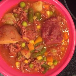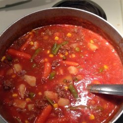 3Drain beef mixture and return to pot with carrots, corn, green beans, juice cocktail, water, salt and pepper. Simmer over low heat 30 minutes, until flavors are well blended and soup is hot.