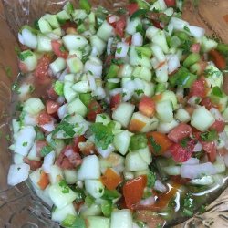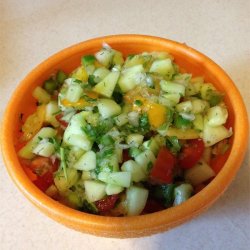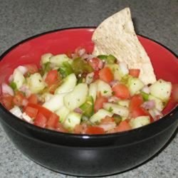 "A great way to use all those cucumbers you get from your plants! A little zing from the jalapeno and a burst of lime add a fresh taste to cucumbers in this refreshing fresh salsa."