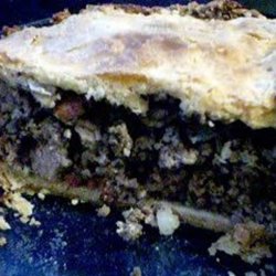 4Fill pastry shell with meat and vegetable mixture. Roll out top crust on top, seal the edges, and put patterned slits in top crust.