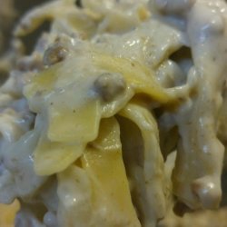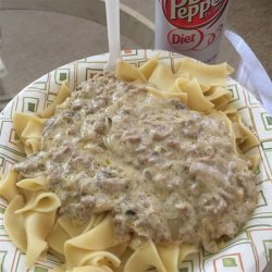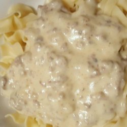 3Sprinkle flour over the beef mixture, stir, and cook for 1 minute. Stir mushrooms and garlic salt into the beef mixture. Pour mushroom soup and chicken soup over beef, stir, and cook until hot, about 5 minutes; add sour cream, stir until smooth, and cook until again hot, 2 to 3 minutes more. Pour beef mixture over the cooked egg noodles.