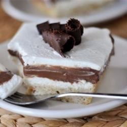 "This is a creamy pudding-like pie. It has thick chocolate filling, thick cream cheese filling, a butter/nut crust, and is topped with whipped cream. Definitely not for those who are on a diet."