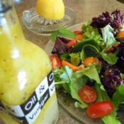 "Tangy, zesty, garlicky lemon and olive oil flavors blend in this dressing that compliments salads which include some type of grilled meat and baked or fried pita chips in the place of croutons. This dressing is best with salads containing grilled chicken, shrimp or fish. It is very tangy but absolutely yummy.