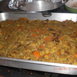 2In a large bowl combine the crumbled cornbread, cooked celery, cooked onions, giblets, oysters, parley, basil, salt, paprika, dried sage and nutmeg. Toss well.