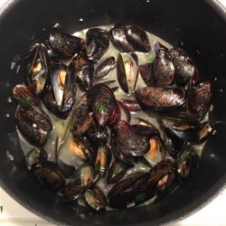 3Meanwhile, in a large skillet place 2 tablespoons butter or margarine, onion, garlic, parsley, bay leaf, thyme and wine. Bring to a boil and lower heat; cook for 2 minutes. Add mussels; cover and cook just until they open, 3 to 4 minutes. Do not overcook.
