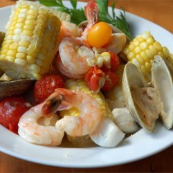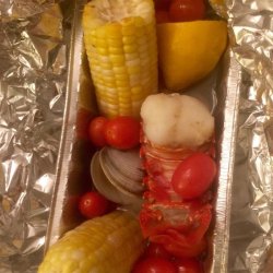 2Spread out the sheets of foil onto a flat work surface, and place 4 clams, 4 shrimp, 4 scallops, 4 pieces of corn on the cob, and 4 cherry tomatoes in the center of each piece of foil. Drizzle 1 tablespoon of lemon-butter mixture over the seafood and vegetables. Bring two opposite ends of a foil sheet together and fold over several times to seal. Leave room for steam. Fold the remaining ends over several times to seal the packet completely.