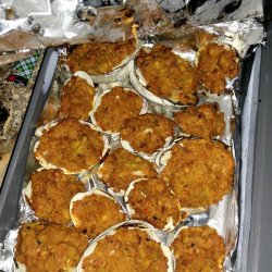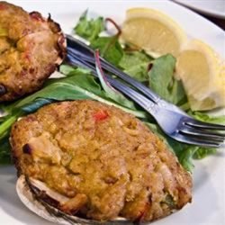 6Mix together the stuffing and sausage/clam/onion mixture. Spoon filling into empty clam shell halves and top each with a small pat of butter (about a third of a teaspoon).