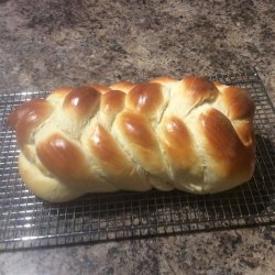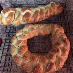 2Punch down the risen dough and turn out onto floured board. Divide in half and knead each half for five minutes or so, adding flour as needed to keep from getting sticky. Divide each half into thirds and roll into long snake about 1 1/2 inches in diameter. Pinch the ends of the three snakes together firmly and braid from middle. Either leave as braid or form into a round braided loaf by bringing ends together, curving braid into a circle, pinch ends together. Grease two baking trays and place finished braid or round on each. Cover with towel and let rise about one hour.