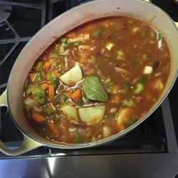 2Stir in tomato paste, and cook 1 minute. Add clam juice, potatoes, canned tomatoes with juice, Worcestershire sauce, jalapeno pepper, bay leaf, and ground black pepper. Simmer until potatoes are tender, stirring about every 30 minutes.