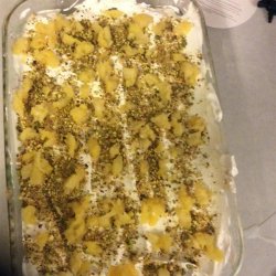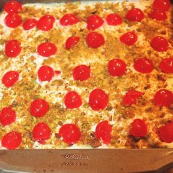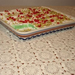 4Mix the instant pudding with milk until thick. Spread the pudding over the cream cheese layer. Top with remaining whipped topping, sprinkle with nuts, and decorate with maraschino cherries.