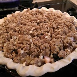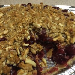 5Pour cherries and any accumulated juices into the prepared pie pan. Press down into the pan. Crumble oat mixture over the top. Place the pan on the prepared baking sheet.