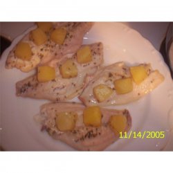 2Arrange the mahi mahi fillets in the prepared baking pan. Pour lemon juice over the fillets, and sprinkle with thyme and basil. Top each fillet with pineapple. Pour milk into the pan, not directly on the fish.