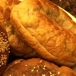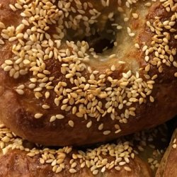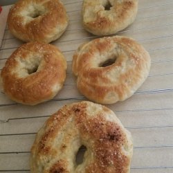 6Broiling option: For a glossier surface, place raised bagels on an ungreased baking sheet prior to boiling them. Broil them five inches from heat for 1 to 1-1/2 minutes on each side. Then put them into the hot water to be boiled as above. Note: do not bake broiled bagels as long as non-broiled ones, 25 minutes should be long enough.