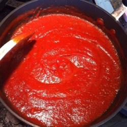 In large skillet, saute garlic in oil until golden. Add tomato paste, sugar, oregano, basil, water, cheese and wine. Season with salt and pepper and simmer 10 minutes over medium-low heat.