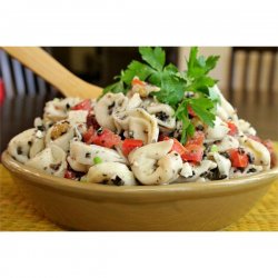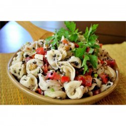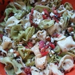 2Mix tortellini, feta cheese, tomatoes, olives, walnuts, green onions, and garlic together in a large bowl.