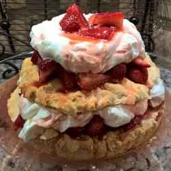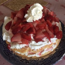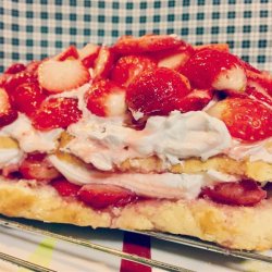 5Slice partially cooled cake in half, making two layers. Place half of the strawberries on one layer and top with the other layer. Top with remaining strawberries and cover with the whipped cream.