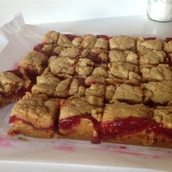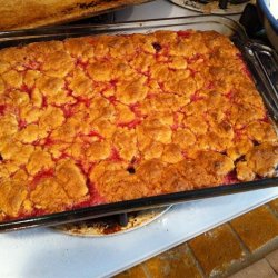 3In a large bowl, mix together the cake mix, melted butter, and eggs. Stir in the oats, brown sugar, ginger and cinnamon. Set aside about 1 1/2 cups of the mixture, and spread the rest into the bottom of a 9x13 inch baking dish. Pack down to form a solid crust, getting it as even as possible. Spread the cooled cranberry mixture over the crust. Pinch off pieces of the remaining mixture and place evenly over the cranberry layer.