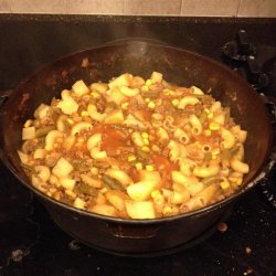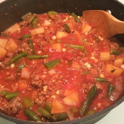Add all ingredients (except noodles) to browned ground meat and simmer for 1 hour, then add noodles.