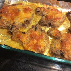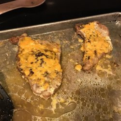 2Place pork chops in a baking pan. Spread 1 teaspoon of butter over each chop, then spread 1 teaspoon of mayonnaise over butter. Season each one with seasoning salt, pepper and parsley. Sprinkle 1/4 cup cheese over the top of each pork chop.