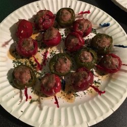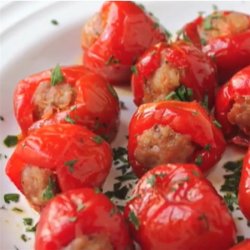 2Pinch about 1/2 teaspoon sausage off and roll into a small oval shape. Stuff the sausage piece into a pepper. Repeat with remaining sausage and peppers.