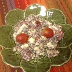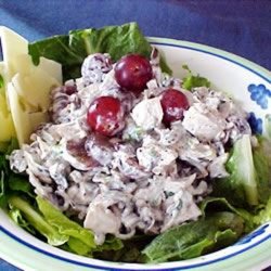 "Easy to make and tastes wonderful. You can use either turkey or chicken. You can serve it plain, on salad greens, or in a pita. Very versatile. If in season, try substituting black cherries for the grapes."