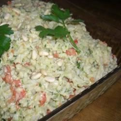 3In a large bowl, combine artichoke hearts, green onions, green bell pepper, parsley, and celery. Mix in cooked rice, then mix in reserved marinade mixture. Cover and chill overnight. Serve cold.