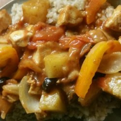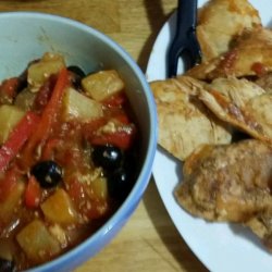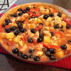"This dish, influenced by the cuisine of the Costa Brava region of northern Spain, marries the saltiness of olives and the sweet, tropical flavors of pineapple. Serve over a bed of rice."