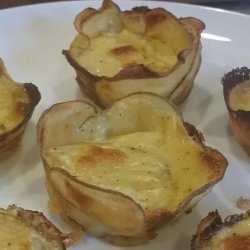 4Divide the potatoes among the 12 prepared muffin cups and spoon cheese sauce over potatoes.
